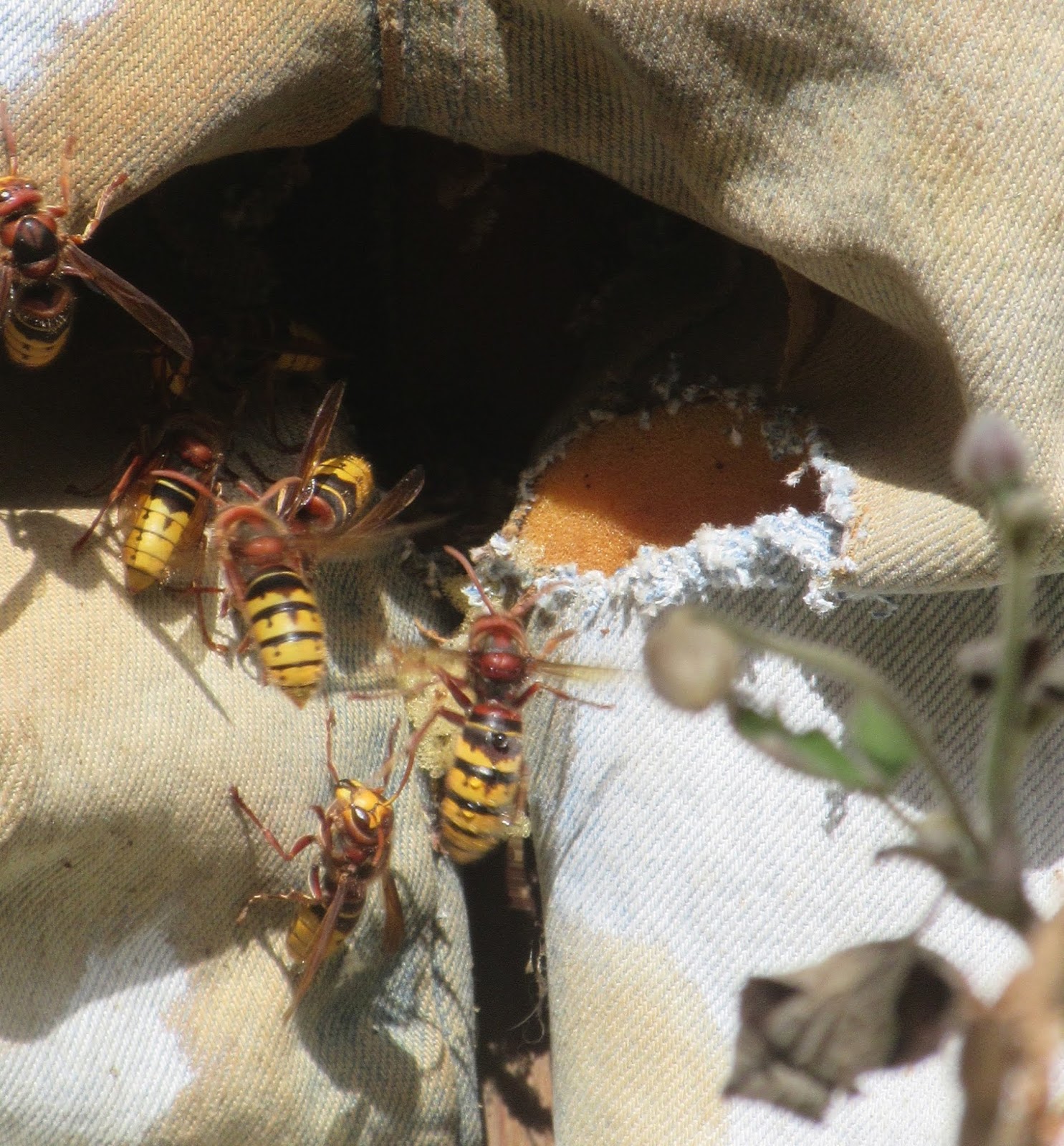 Es sind nun erheblich mehr Hornissen und man begegnet ihnen auch im restlichen Garten. Weil der Kot aus der Vogelscheuche mit dem Nest nicht einfach nach unten herausfallen kann, hat sich eine braune Verfärbung an dem Ausflug Loch zwischen den Beinen gebildet. Eine Hornisse ist damit beschäftigt ein neues Loch in ein Hosenbein zu knabbern. Ich denke es wir ein zweites Ausflugloch.